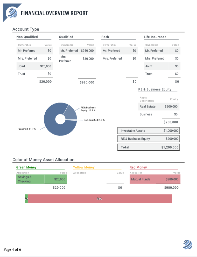 A complete snapshot of your financial life including assets, income sources, expenses, and retirement projections so you can see the big picture clearly.