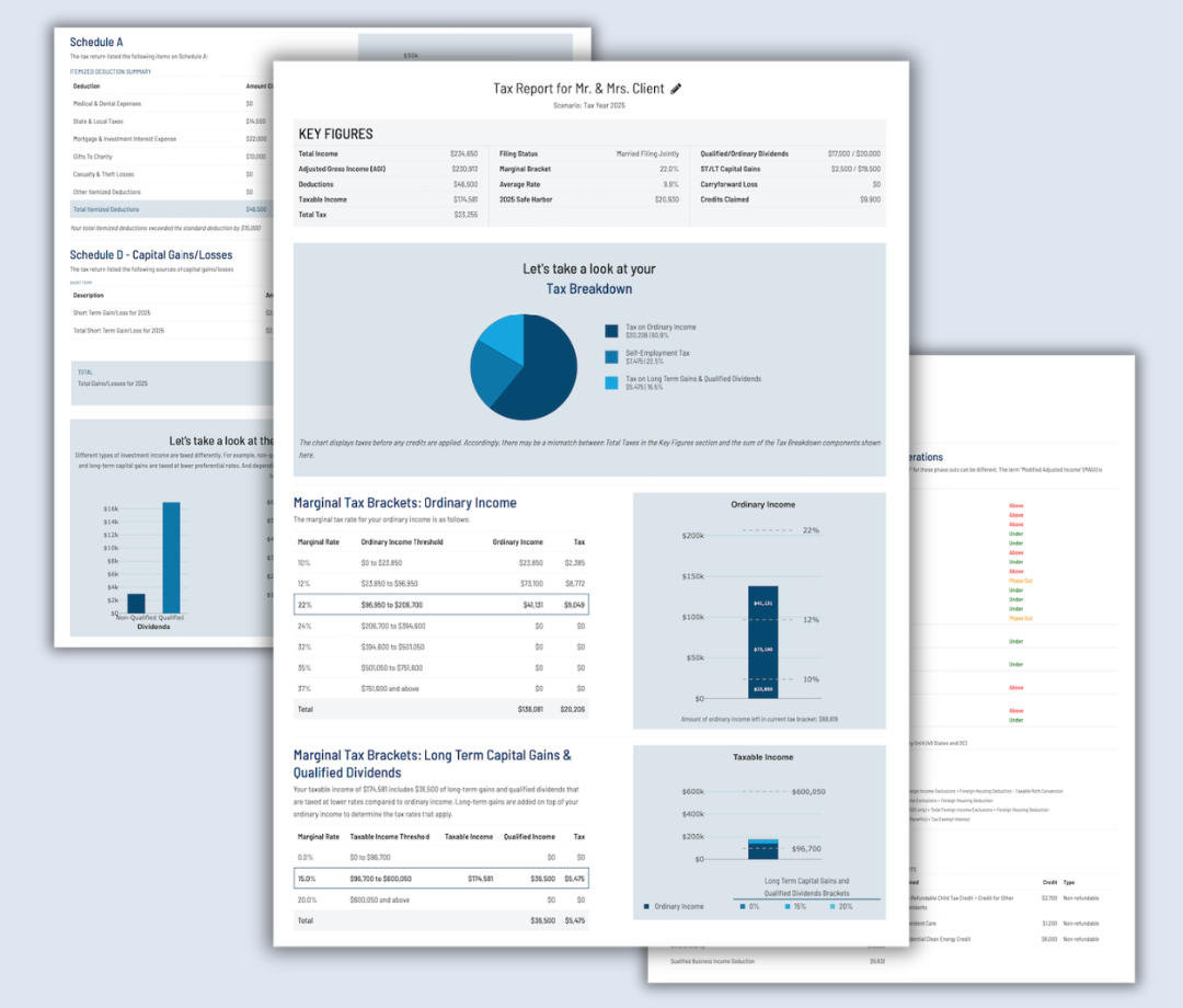 Your retirement plan is built using several key reports that help us evaluate your income strategy, investment risk, asset allocation, and overall financial picture so everything works together.
